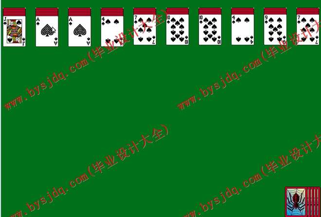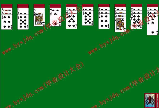在“游戏”菜单上,单击“开局”开始游戏。牌面上有十叠牌,前四叠每叠6张,后六叠每叠5张,只有每叠的第一张正面朝外,其他均为正面朝内。界面的右下角有五组共计50张牌,没有全部翻开。windows xp版本中,界面的中下方的方框中显示的得分分数(开局为500分)和已操作数。vista版本中,没有该框,分数及操作数显示在界面的最下方。