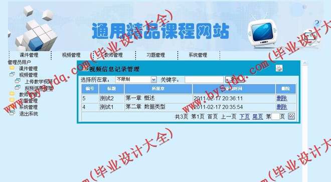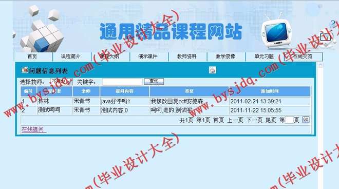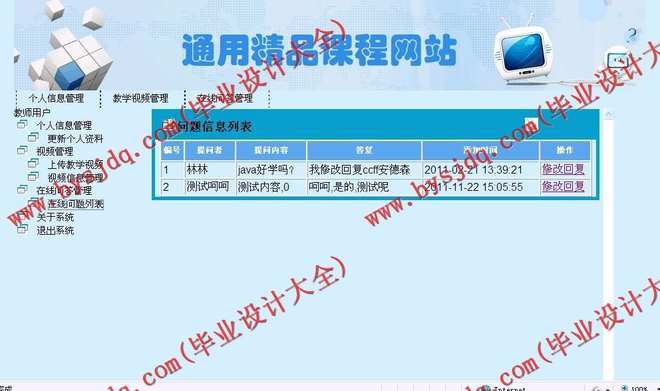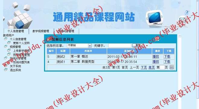 不同的用户对系统的使用权限不同,学生可以通过浏览网站快速的选择自己想要查看的课程相关内容,还可以向教师留言提问;每个教师可以对自己的课程内容做电子资料的增删、回答学生提问等;管理员可以对教师做增删、对网站进行维护工作。