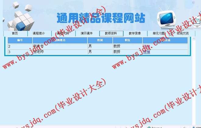 根据前几个阶段的分析和设计,本系统在设计方面采用B/S模式,同时使用JSP技术进行基本页面的设计与功能实现,后台数据库选用SQLSERVER数据库。本系统的设计实施为通用精品课程网站的运行做基础,为通用精品课程网站提供良好的条件。