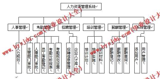 人力资源管理系统由人事管理、考勤管理、招聘管理、培训管理、系统管理5部分组成,规划系统功能模块如下: