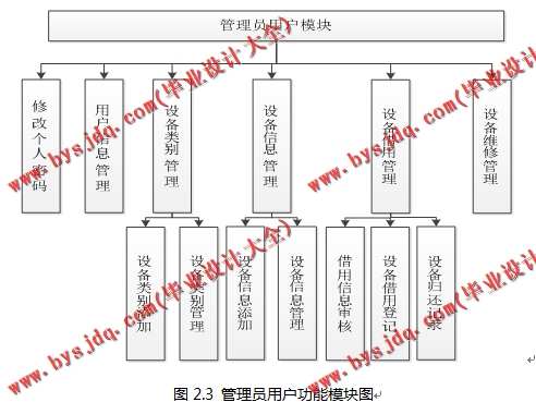 (2)管理员用户具有注册用户管理、设备类别管理、设备信息管理、借用管理及设备维修管理等功能。