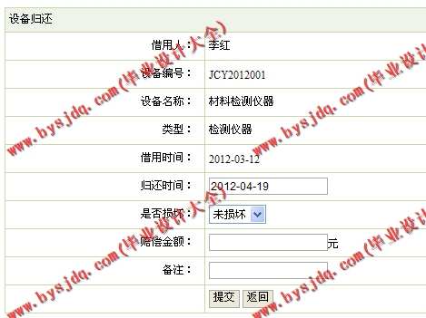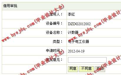 (4)设备借用管理模块:在该模块中定义了设备借用的管理,其功能包括借用信息的审核、借用登记及设备归还登记。