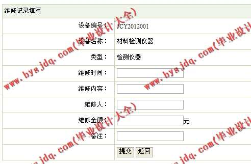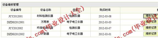 (5)设备管理模块:在该模块中定义了维修信息的管理,其功能包括维修记录的添加、查询等操作。