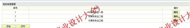 (1) 班级信息管理模块:在该模块中定义了班级信息的管理,其功能包括班级信息的录入、查询、删除、打印等操作。
