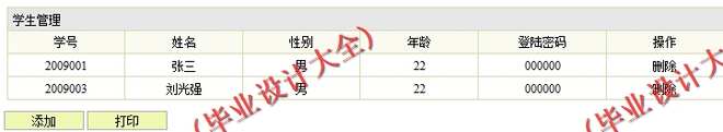 (3) 学生信息管理模块:在该模块中定义了学生信息的管理,其功能包括学生信息的录入、查询、删除、打印等操作。