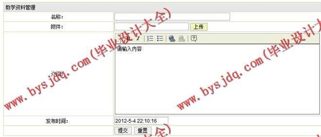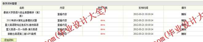 (6) 资料信息管理模块:在该模块中定义了资料信息的管理,其功能包括资料信息的录入、查询、删除等操作。