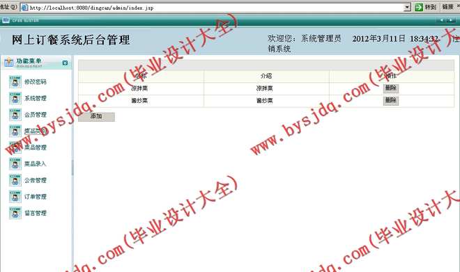 ⑧菜品类别管理:可以管理菜品分类信息。添加和删除分类信息