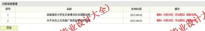 本系统前台主要使用J2EE作为开发语言,后台使用SQServer作为数据库管理系统,开发环境是MyEclipse,服务器采用tomcat。系统的主要功能包括:管理登陆、问卷调查题目及内容选项的添加、修改和查询,调查结果统计等。分为管理员用户、普通用户这二种用户平台。