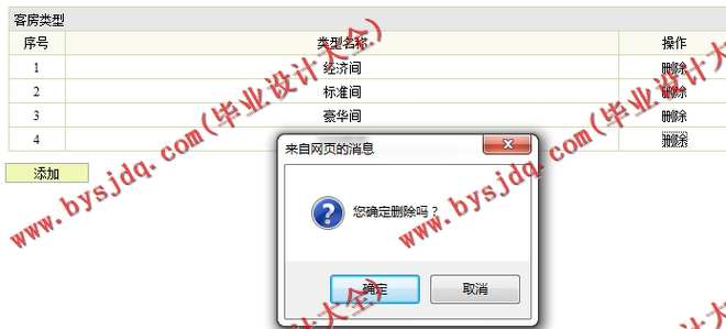 (2)客房类型管理模块:在该模块中定义了对客户类型的管理,其功能包括客房类型的录入、查询、删除等操作