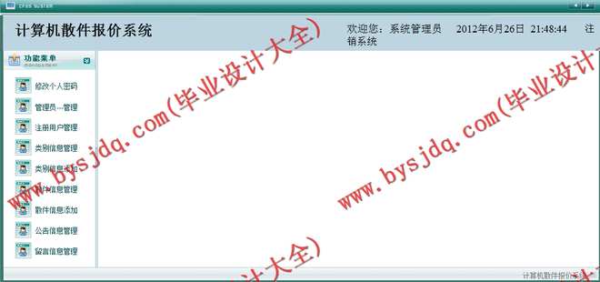 该散件报价系统主要实现的功能是:普通用户可以查询自己所需要的散件信息,通过比较购买,随时了解时事散件的最新价格;管理员可以对系统进行维护管理,管理用户信息并可以重置密码,查看用户的订单并对其确认,查看,添加,删除,更改散件信息。其核心功能模块是用户功能模块和管理员功能模块。
