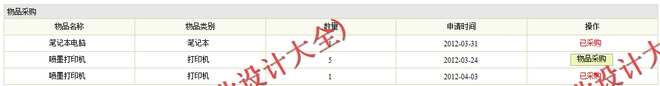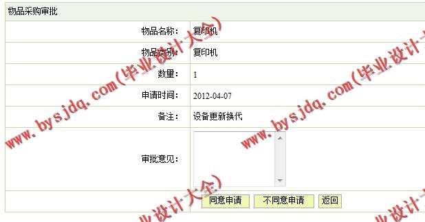 (3)物品采购审核模块:在该模块中定义了对采购信息的管理,其功能包括采购信息浏览、审批等操作。