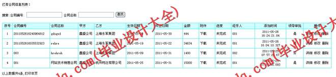 合同管理模块主要实现对合同的增、删、改、查,下载等操作。管理员可以管理合同,对合同进行查询,为了使查询更加简便。系统提供两种查询方式,一种是按照编号进行查询,另一种是按名称进行询,可以通过查询的结果链接到合同的修改或删除页面,对合同进行修改或者删除。