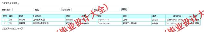 客户管理模块主要实现对客户的增、删、改、查等操作。管理员可以添加客户、按照客户编号,姓名,公司名称或者电话进行客户查询,通过查询条件的结果链接到客户的修改或者删除页面,对客户进行修改删除等操作。