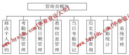 (2)管理员用户具有教师信息管理管理、当日考勤登记、考勤类型管理,考核日期管理、考勤统计、历史考勤查询管理、系统管理功能