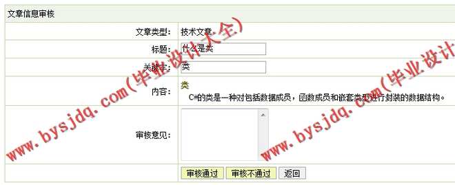 (4) 文章审核模块:在该模块中定义了文章审核的管理,其功能包括文章信息的浏览、审核等操作。