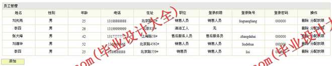 (3)员工信息管理,首先录入普通员工的信息。然后根据用户的职位分配权限,点击“分配权限”按钮,系统弹出分配权限的对话框,包括权限名称、登录密码。登录密码等