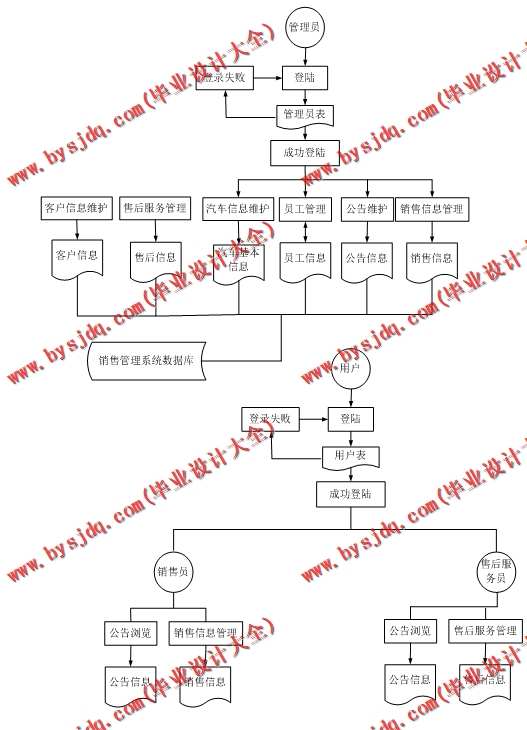 (1)系统管理员管理整个系统,包括公司员工的管理、汽车信息的管理、汽车销售信息的管理、售后服务的管理等