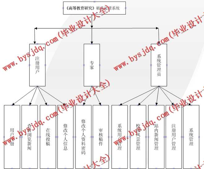 基于系统功能需求的需要,我们把用户分成四种类型:普通访客、注册用户、专家、系统管理员。不同的类型设置不同的权限[10]。例如:当普通访客进入系统时,其操作权限是在线留言浏览;当作者进入系统时,作者通过用户名和密码就可以进入在线留言进行投递新稿、上传修改稿、删除稿件和下载论文等操作;当专家进入系统时,专家通过用户名和密码就可以对稿件进行评审提交评审意见、下载论文等操作;当系统管理员(如:编委,编辑部成员等)进入系统时,可以对注册用户信息、专家信息、站内新闻,校园风景等进行维护管理等操作。为了更清楚地说明系统框架,在此给出系统操作流程图,如图3-1所示