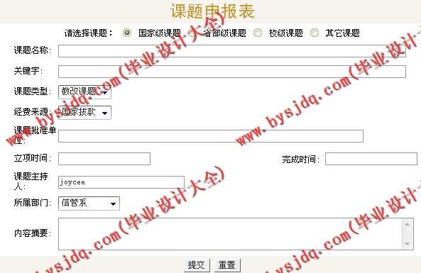 4.课题申报模块(进入论文申报页面,需填以下信息:课题类型,课题名称,关键字,经费来源,课题批准单位,立项时间,完成时间,课题主持人,所属部门,内容摘要)。