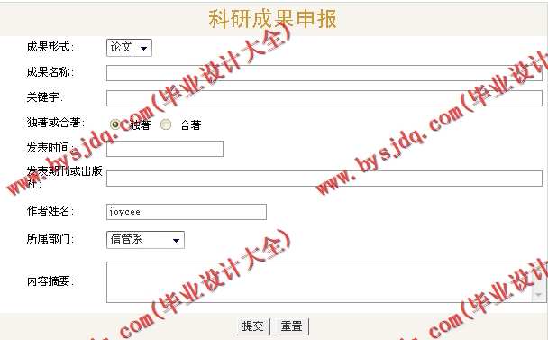 3.成果申报模块(进入成果申报页面,需填以下信息:成果形式,成果名称,关键字,发表时间,发表期刊或出版社,作者姓名,所属部门,内容摘要)。
