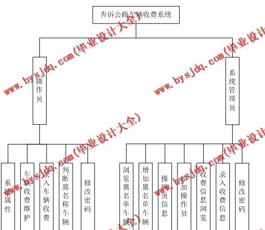 本系统的系统结构是按照了自上向下的设计理念完成的。第一层是用户登录界面。第二层是系统主页,主要包括黑名称车辆管理管理,操作员用户管理、车辆收费管理、修改密码等,用户登录成功后可以转至各个管理功能。第四层即各个管理功能的所有功能。