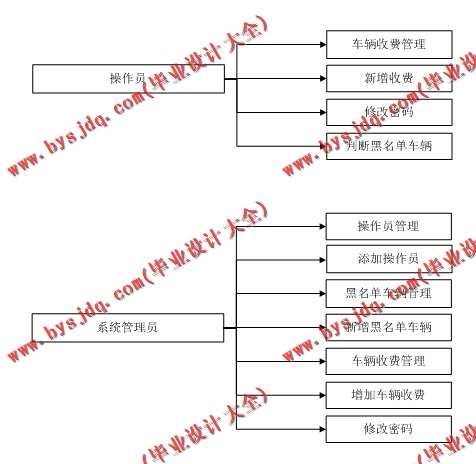 系统管理员模块:只有系统管理员才具有该模块的权限。该模块需要实现操作员用户、黑名单车辆、车辆收费等管理,另外通过该模块可以浏览车辆收费,维护黑名单车辆,操作员等信息。黑名称车辆参数具体包括车牌号和备注2个方面的信息。