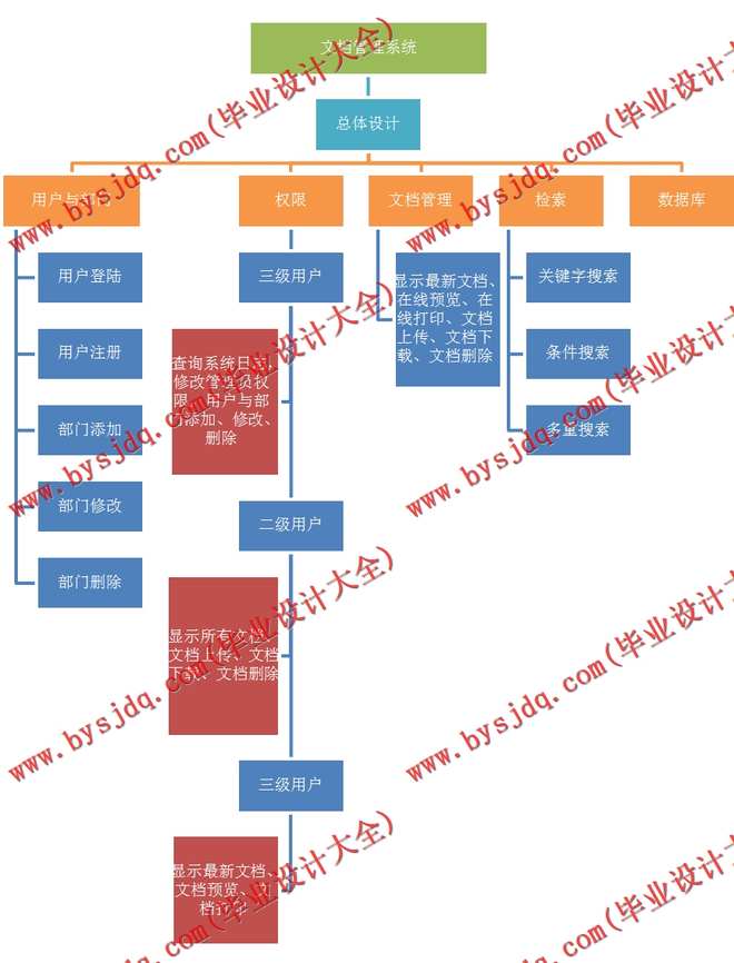 系统包括:权限管理、用户与部门管理、数据库、文件管理、检索模块。