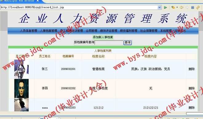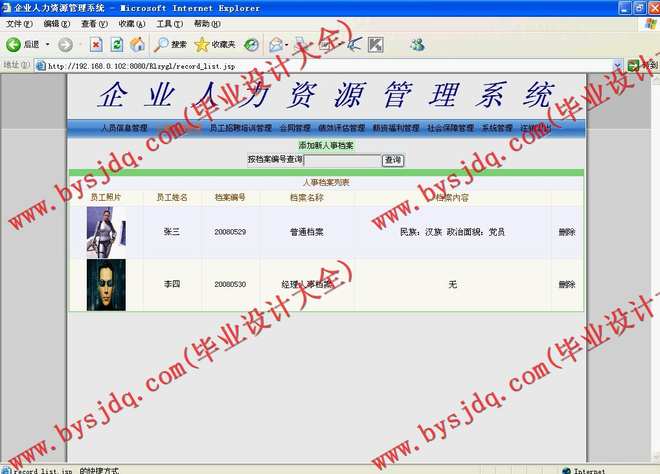 4)人事档案管理:包括人事档案的增加、删除、修改及查询等操作(支持员工照片上传功能);