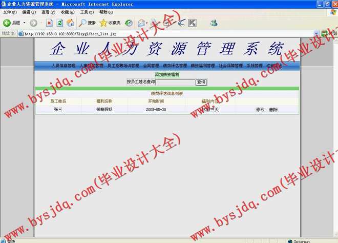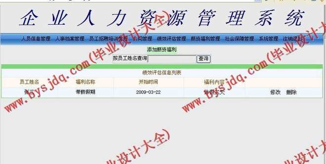 6)薪资福利管理:包括员工薪资福利信息的增加、删除、修改及查询等操作;