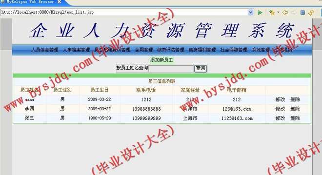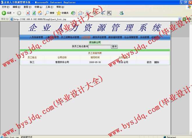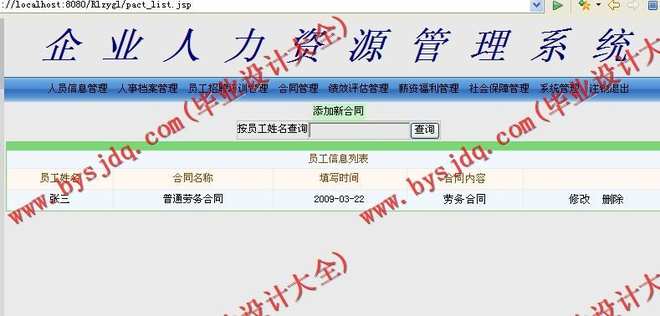 2)合同管理:包括员工劳动合同信息的增加、删除、修改及查询等操作;