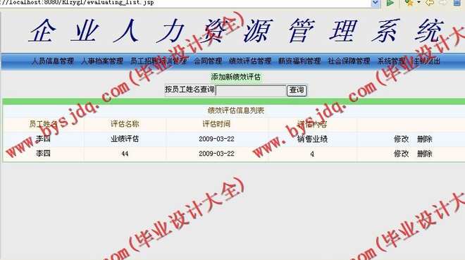 5)绩效评估管理:包括员工绩效评估信息的增加、删除、修改及查询等操作;