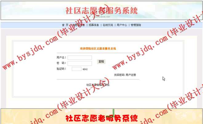“社区志愿者服务系统”是基于Web的应用系统,为社区居民和志愿者之间提供一个互助的平台,能够使需要得到帮助的居民特别是社区的老人得到志愿者的真心帮助,让志愿者在社区献出他们的一份爱心,为和谐社区做出一份贡献。系统设置管理员、用户和志愿者三种权限。用户只能对个人在志愿者的预约情况进行查询、取消、修改等操作以实现自己的安排而管理员有对志愿者进行管理的权限。具体实现功能如下: