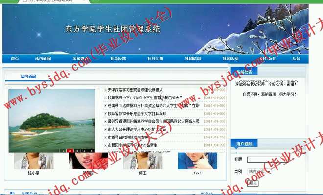 对于网站除了选取有优势的语言和开发工具外,还有如网络基础设施、实时动态网上东方学院学生社团管理、数据交互等诸多问题。虽然当今开发网站系统的开发工具很多,但是如何开发出一种同时具有耗费系统较少资源、具有较快的运行速度、较高的安全性、低成本的系统成了问题的关键。用JSP开发的网站系统无疑具有众多优点,因此本系统就是一个高性能的网站系统雏形,经过扩展和优化即可以用做网上东方学院学生社团管理用途,适合学校进行网上东方学院学生社团管理。