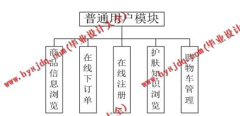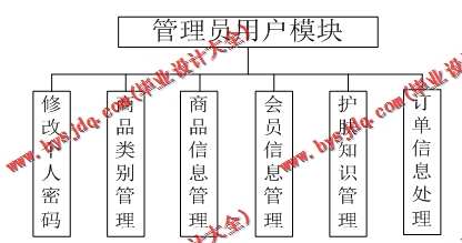 普通用户功能模块图说明:普通用户可以在线浏览商品,查询商品,浏览护肤知识,如果要购买、下订单操作,首先需要注册一个个人账号,然后登陆到系统中管理员功能模块图说明:管理员是功能最多的一种用户角色。