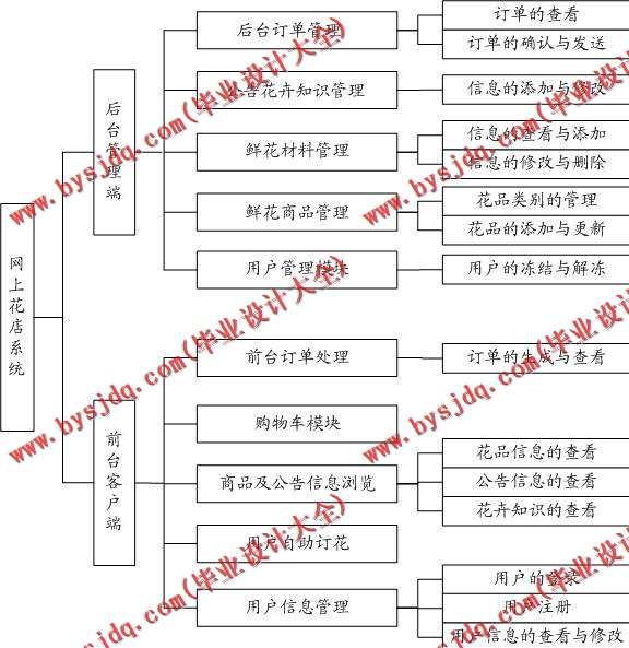 系统主要由两部分组成,一部分是后台管理部分,商家管理相关信息发布,商品管理,订单管理,客户管理等;另一部分是前台销售部分,客户通过浏览器访问登录,浏览本店订购鲜花。