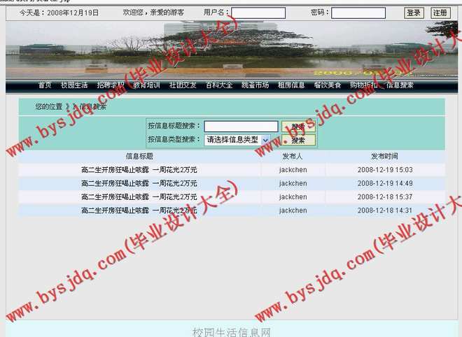 此“校园生活信息网”的开发定位于一个能够满足数据库管理软件,即具备一个数据库管理软件的基本功能,包括数据的增加,删除,修改,查询,统计等,便于用户查看,操作,和查询各类登记信息。共有“校园生活、招聘求职、教育培训、社团交友、百科大全、跳蚤市场、租房信息、餐饮美食、购物折扣”九个板块,本网站的目的是服务与学生的日常生活。此外,系统具有用户登录功能,不同用户有不同的权限,这样可以提高数据的安全性和可靠性。系统采用JSP程序设计语言的程序设计与数据库相结合的手段进行开发,结构紧凑、运行速度快、操作简单,更因为拥有自己的源代码,所以保证了软件具有高度的保密、安全性,本系统将信息发布人员方便、安全、高效的进行各类信息的发布,同时更有利于管理者对信息进行管理。