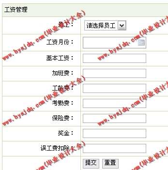 (6)工资管理主要是对员工的工资进行管理,不仅可以进行添加、删除,还可以进行查询,不过必须根据员工姓名进行查询。