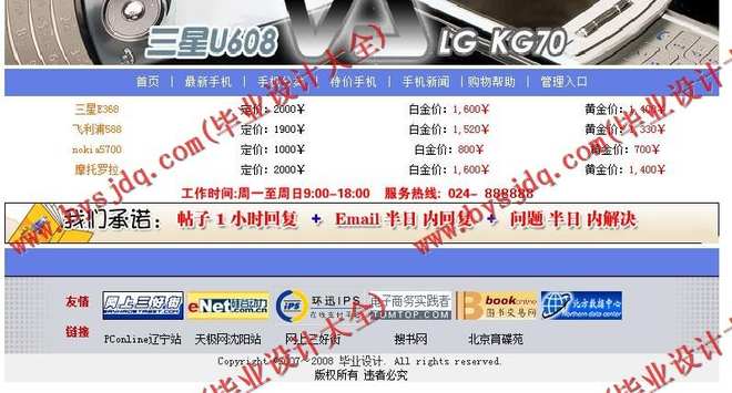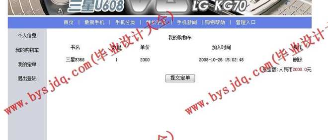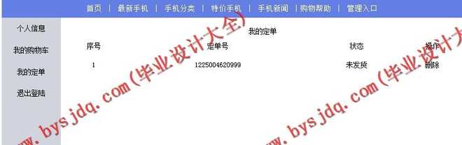 5.订购手机:成功登陆的用户可以在该页面定购所需要的手机。如果用户还没有注册就直接进入或者没有成功登陆就进入页面,将被连接到“用户登陆页面”。