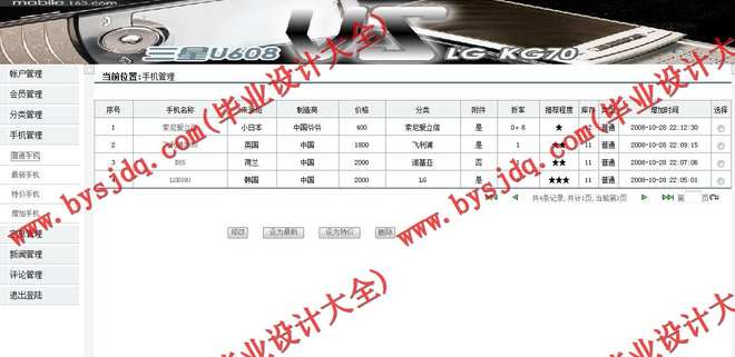 4.手机型号浏览:成功登陆后的用户可以分页浏览手机手机型号,并将想要的手机提交到填写订单页面。如果用户还没有注册就直接进入或者没有成功登陆就进入页面,将被连接到“用户登录页面”。