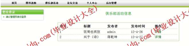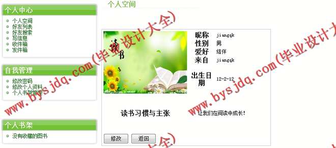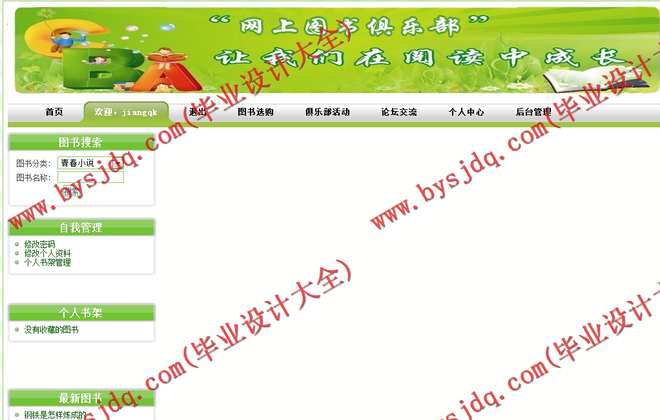 本系统主要包含六个模块:个人中心、图书管理、书架管理、图书选购、俱乐部活动和论坛交流,并对每一个模块都进行了详细的设计。使用本系统可以使用户足不出户就享受到阅读图书的乐趣,并且与读书爱好者一起交流读书经验、心得,可以更好的促进彼此的关系,使身心得到健康稳固发展。在系统中,为大家提供了图书分类、通过章节查询图书内容、支持模糊查询、交友、俱乐部活动信息查看、图书选购等功能。