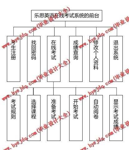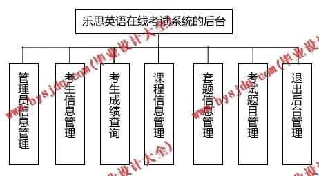 根据乐思英语在线考试系统的特点,可以将其分为前台和后台两个部分进行设计。前台主要用于考生注册和登录系统、在线考试、查询成绩以及修改个人资料等;后台主要用于管理员对考生信息、课程信息、考题信息和考生成绩信息等进行管理。