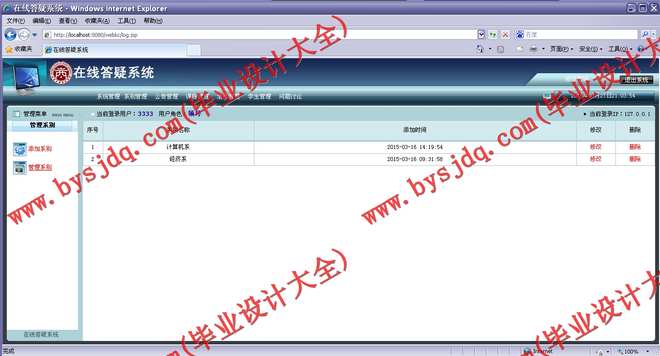 (6)系别管理:校领导可以对本系统中的系别信息进行管理,进行查询与添加的功能操作。
