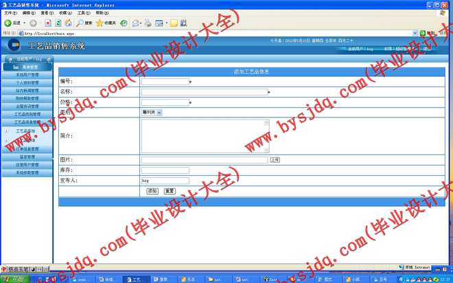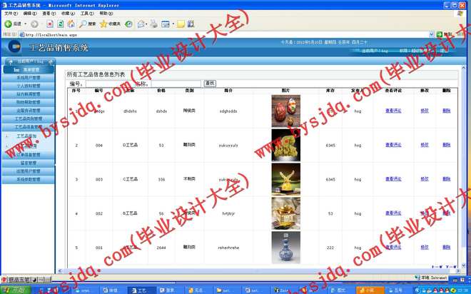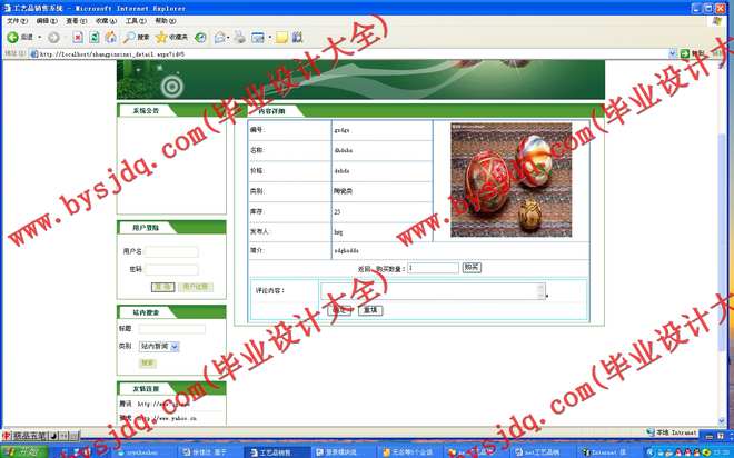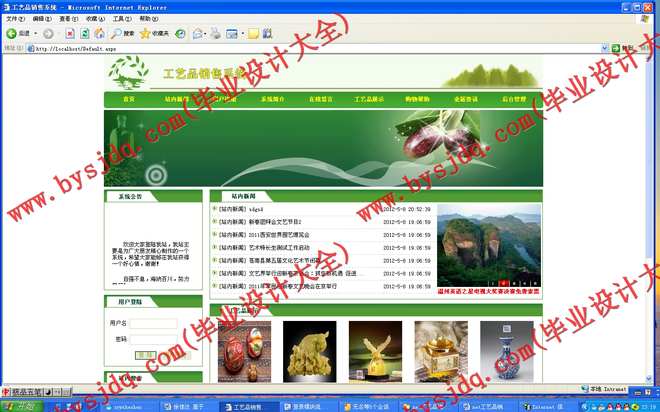 设计并编制一个基于B/S结构的工艺品销售系统,实现网上销售。该网站充分利用网络手段,方便、快捷满足人们的需要。实现对工艺品的采购,营销,信息管理和发布,公司宣传。传统的工艺品销售存在许多弊端,如商品种类太少,经营成本高等。相比之下网上销售具有以下优势:商品种类多,信息量大;检索、订购快捷方便;经营成本低,商品价格低廉;节约顾客购买时间;为了降低销售的成本,节约顾客的时间,方便顾客查找产品。开发该销售系统,使系统具有上前台网销售模块、后台数据录入模块、后台数据处理模块、用户注册功能模块、订单号模块、商品展示方面功能、用户交流方面功能等等,达到数据共享、降低成本、提高效率、改进服务等目的。