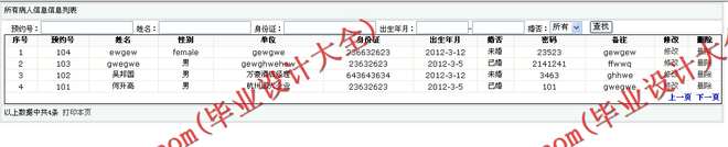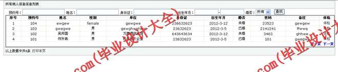 2)病人信息,包括数据项:系统预约号,姓名,性别,身份证,婚否,出生年月等。