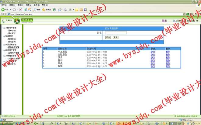 4)商品类别,包括数据项:分类编号,分类名称,添加时间等。