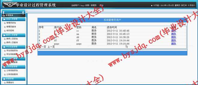 本课题的题目为《梧州学院毕业设计过程管理系统的研究与实现》,旨在分析设计一个学生毕业设计过程管理系统,该系统用于本校毕业生毕业设计过程的管理,所具有的功能有:用户登录功能、文件的上传与下载功能、信息查询功能、信息发布功能等。学生可以登录系统查看有关毕业设计的信息,上传与下载毕业设计文件,查看历史记录和成绩;导师可以登录系统下载学生上传的毕业设计文件并给予评分评语、还可以上传有关毕业设计文件;管理员可以通过后台管理进行添加、删除、查询、修改信息等操作。