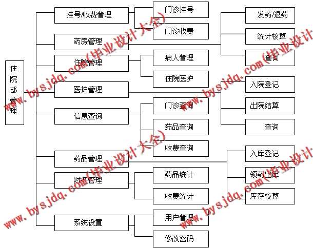 病人信息管理功能:主要包括病人住院基本信息的录入、修改、查询,住院号由系统自动分配。具体来说,管理功能包括管理病员收住、床位设置、科内转床、转科申请、转院出院。查询功能包括可以按住院号、住院日期、姓名、科室进行查询。对于查询到的病人可以对其住院的基本信息进行修改,还可以对住院费用信息、用药信息进行打印。