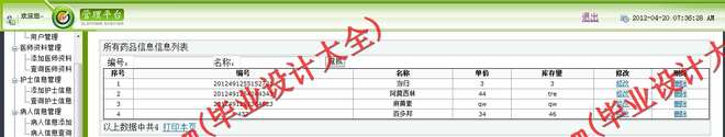 药品管理功能:设置功能包括设置药品名称、药库编号、药品调价、记录清理操作,入库功能包括药品入库、记录查询、操作统计、药品统计、供货单位、入库单打印。开单功能包括调拨开单操作、开单记录查询、开单操作统计、开单药品、打印。库存核算功能包括药品数量盘存、药品金额盘存、盘存记录查询(包含操作和药品统计)报损功能包括药品报损、报损记录(含操作和药品统计)、报损原因、打印报损单。查询功能包括药库明细表以及药库报警表。