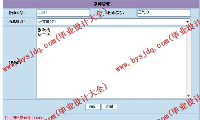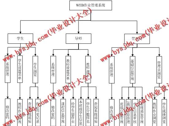 本系统按照功能角色划分为三重,管理员、教师和学生;管理员主要是进行日常的信息维护,如班级信息管理、教师信息管理、学生信息管理等,并可以进行相关的查询功能;教师主要是维护自己的课程和发布作业、查看学生完成情况等;学生就是上传自己的作业信息,同时可以查看历史分数信息等。
