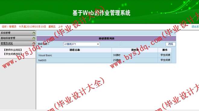 基于WEB的作业管理系统,以下简称【本系统】是利用当今最流行的互联网莫斯开发而成,即B/S模式,前端采用Asp.Net语言开发,后端采用SqlServer数据库做数据存储,本系统在开发中遵循了软件开发的所有流程,从需求分析到系统测试都验证完成。